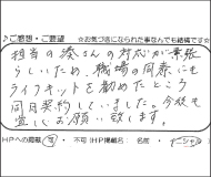 担当の対応が素晴らしいため、職場の同僚にもライフキットを勧めたところ同月契約していました。